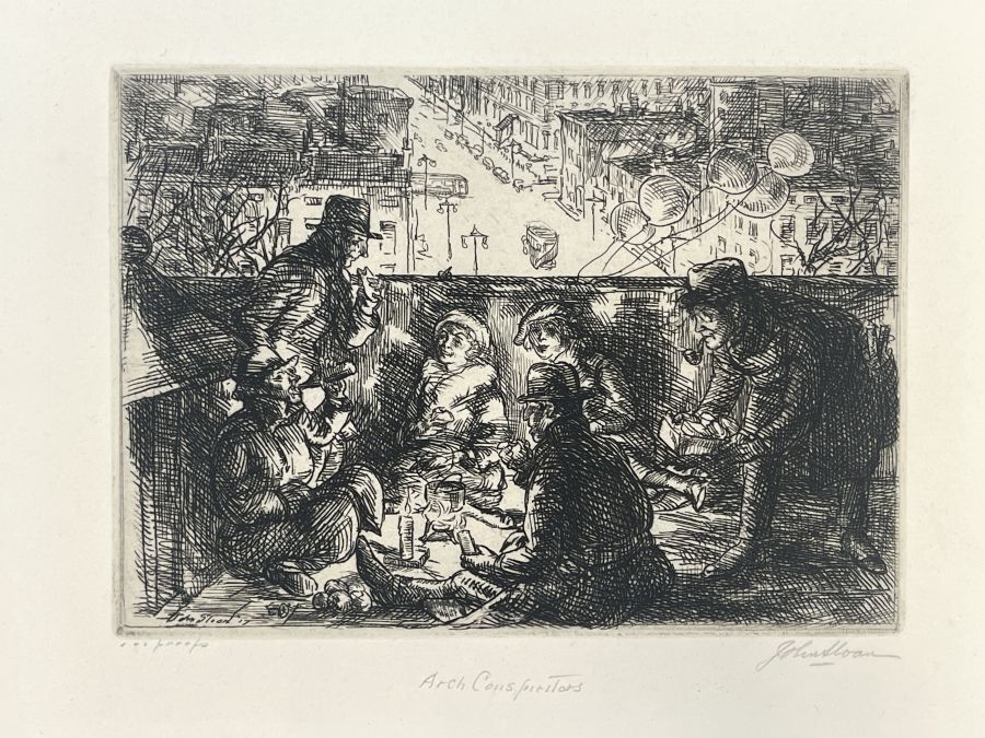 Sloan, John. ARCH CONSPIRATORS. Morse 183 Etching, 1917.Edition of 100. Signed by Sloan, titled, and inscribed 100 proofs, and also signed "Ernest Roth, imp/(old paper)." With a lebel from Kraushaar Galleries, Sloan's dealer, on the back of the mat. 4 1/2 x 6 inches (plate) 12 1/4 x 10 1/8 inches (sheet). In excellent condition..