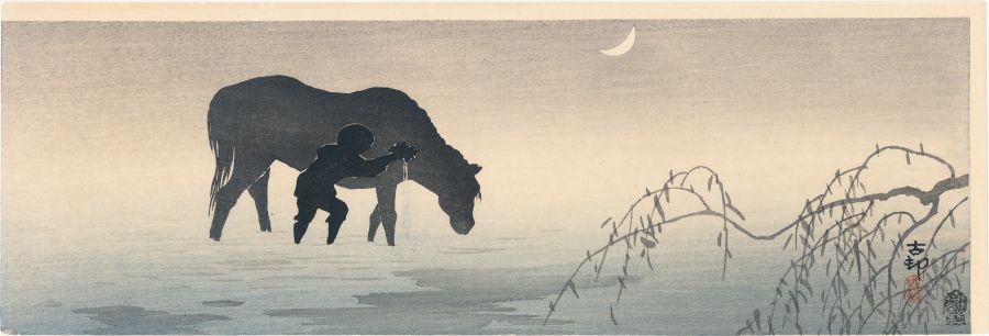 A man washes his horse in shallow water, the crescent moon suspended above in a twilight sky. A willow tree lowers its branches, lower right. All are defined by their silhouettes and printed in shades of grey and black. A surprisingly strong and effective design for its size. This is apparently one of Koson’s earliest prints, and it was never reprinted.