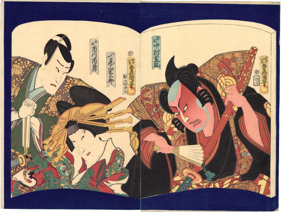Title: Diptych of Kabuki actors posed in an open book from the play Dan no ura kabuto gunki 壇浦兜軍記~阿古屋 Date: 1862/10