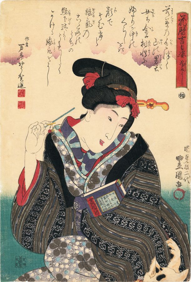 A young woman looks charmed by her cat, adjusting her hairpin with her right hand and looking down at the cat with gentle amusement.  In her left arm she holds a famous educational book of women’s “morals and manners” of the time, “On’na teikin gosho bunnko” 女庭訓御所文庫. The cover shows the index, with topics such as a wise women’s role in the family, the proper attitude towards a husband, harmony with men, etc. She seems to come from a prosperous family, as she wears several layers of fashionable kimono. The design cleverly pulls our eye towards the cat at lower right, even though the feline is mostly hidden. His fur features blindprinting.