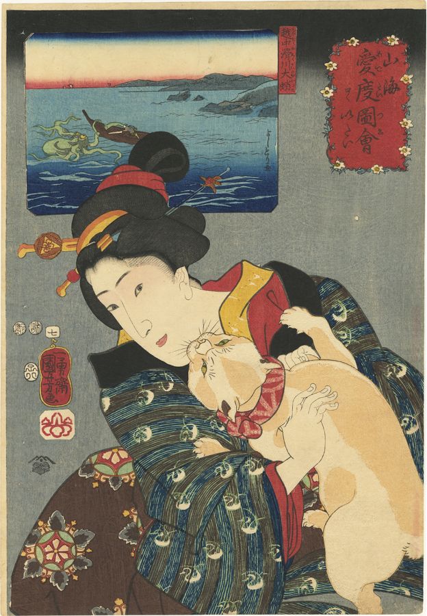 A feisty pet bobtailed cat clambers up his owner's kimono, digging in his claws in the process. She has obvious affection for the cat, but at the moment she is not too keen on the attention. The title reflects the feeling of “It hurts!”, the humorous title of the work. We can imagine the sharp points of the cat’s claws inadvertently causing pain as it digs them in. In the inset vignette we see a giant octopus threatening a man in a small boat in Etchû Province; the man has even severed a tentacle with a long knife. In this humorous comparison, perhaps the woman feels overwhelmed by the needs of her kitty, and he seems to have as many claws as the octopus has tentacles. In this series, we see bijin of various occupations and social strata expressing a specific desire or feeling. In the background a Kuniyoshi pupil draws a comparison of sorts with famous regional products. The celebrated product is Giant octopus from the Nameri River in Etchû. The cat’s fur features extensive blindprinting, as does the red layer of the beauty’s garments. One of the strongest cat designs in ukiyo-e, by the artist who is most celebrated for his cat depictions. Scarce, especially in this condition.